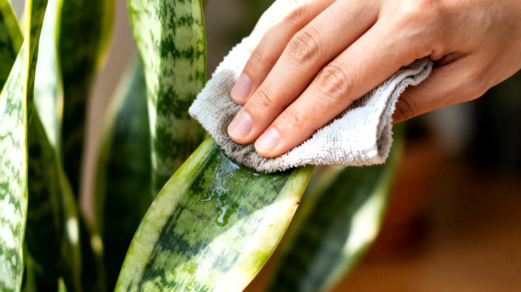 Leitungswasser enthält oft Kalk, Natrium und Chlor – Rückstände, die bei häufigem Wischen auf Blättern sichtbare Flecken hinterlassen können. Deshalb empfiehlt es sich, destilliertes oder gefiltertes Wasser zu verwenden, besonders bei glänzenden Sorten wie Sansevieria trifasciata Laurentii.